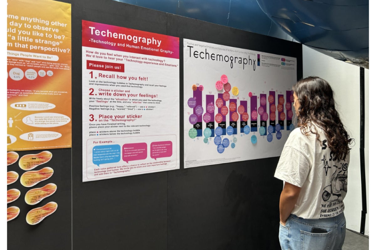 現地では、日本での調査結果を元とする各テクノロジーに寄せられる感情の分布と具体的なエピソードをポスターで展示し、そこに来場者が自身の体験や感情を付箋で書き加えられる参加型の仕組みを設けました。異なる文化的背景や専門性をもつ来場者の声が重なり合うことで、テクノロジーに対する微細な感情の揺れが立体的に浮かび上がっていきます。会場で寄せられた来場者の声からは、いくつかの印象的な気づきが浮かび上がりました。