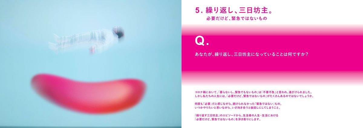 こうしたいわば「繰り返す、三日坊主」のような身近なエピソードにまつわる問いを通して、生活者の日常の奥にある意識をすくい上げ、個人や社会の隠された意志を可視化していきます。