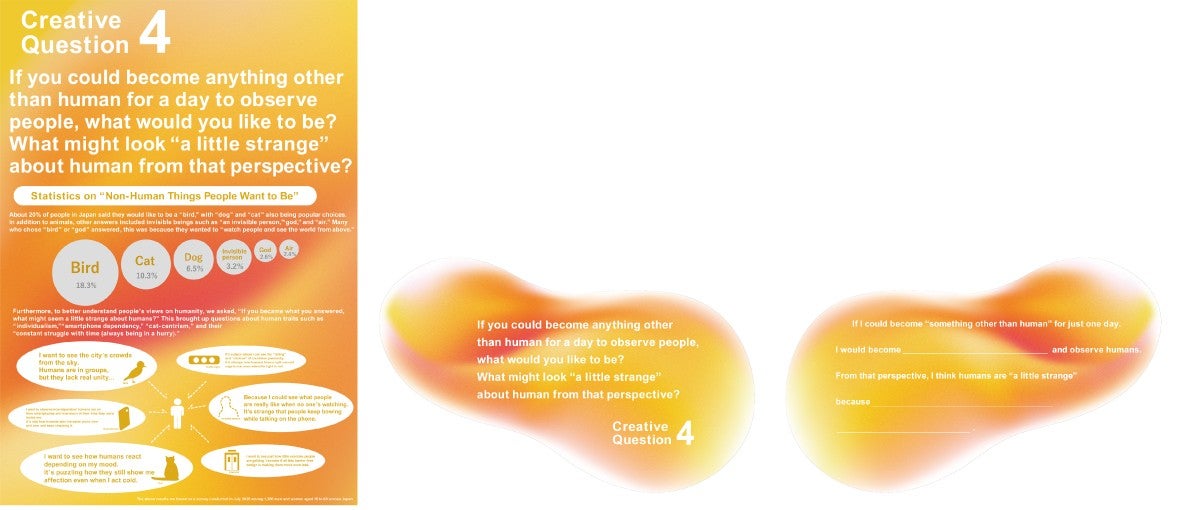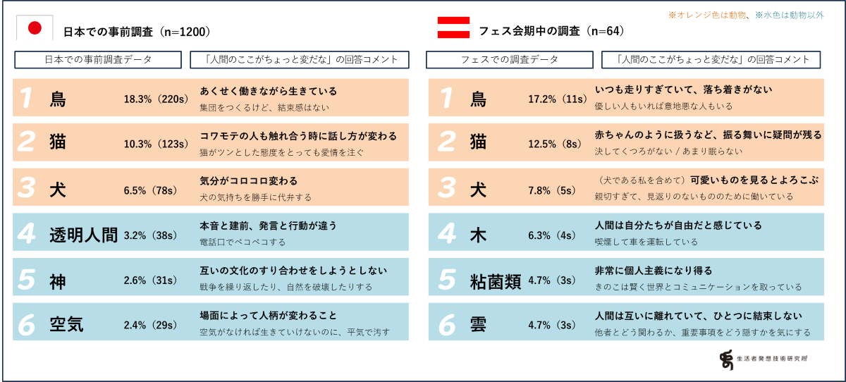 まず、「一日だけ人間以外になれるとしたら、何になって人間を観察したいですか」という問いへの回答1~3位は、日本・フェスティバル会場ともに「鳥」「猫」「犬」でした。身近な存在を通じて、人間を観察し直そうとする視線が共通しています。また、「その際、人間のここがちょっと変だなと思うこと」の回答では、日本・会場ともに「多忙な生活」に言及されました。現状の加速し続ける社会に対して精神的負荷が高まっている現況に疑問をなげかけているのかもしれません。