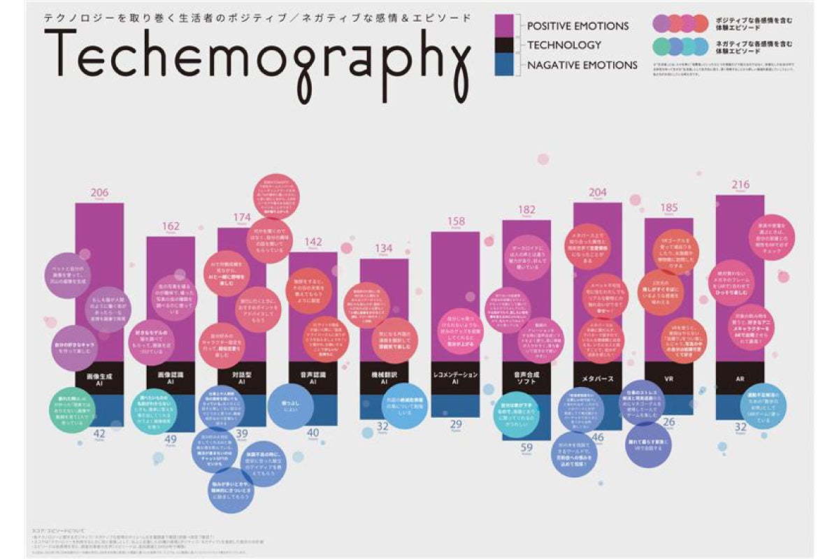 続いてご紹介するのが「Techemography(テケモグラフィー)」です。Tech(テクノロジー)+ emotional(感情)+ graphy(描く)を掛け合わせた造語で、進化するテクノロジーに向けられた生活者の感情を可視化する試みです。