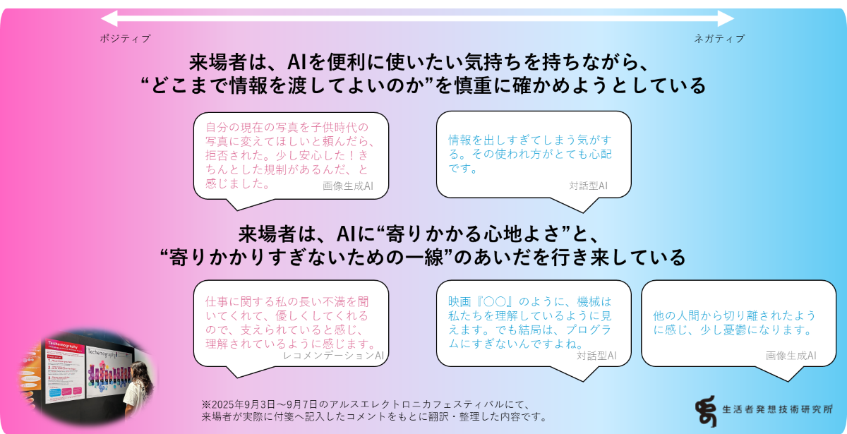 もう一つは、来場者はAIに“寄りかかる心地よさ”と、“寄りかかりすぎないための一線”のあいだを行き来している感覚が目立ちます。「仕事に関する私の長い不満を聞いてくれて、優しくしてくれるので、支えられていると感じ、理解されているように感じます。(レコメンデーションAI)」という声がある一方で、「他の人間から切り離されたように感じ、少し憂鬱になります。(画像生成AI)」という声も寄せられました。効率や慰めをもたらす存在であると同時に、孤立感や違和感をも生み出す存在として、AIは生活者の中で両義的に位置づけられていることがわかりました。
