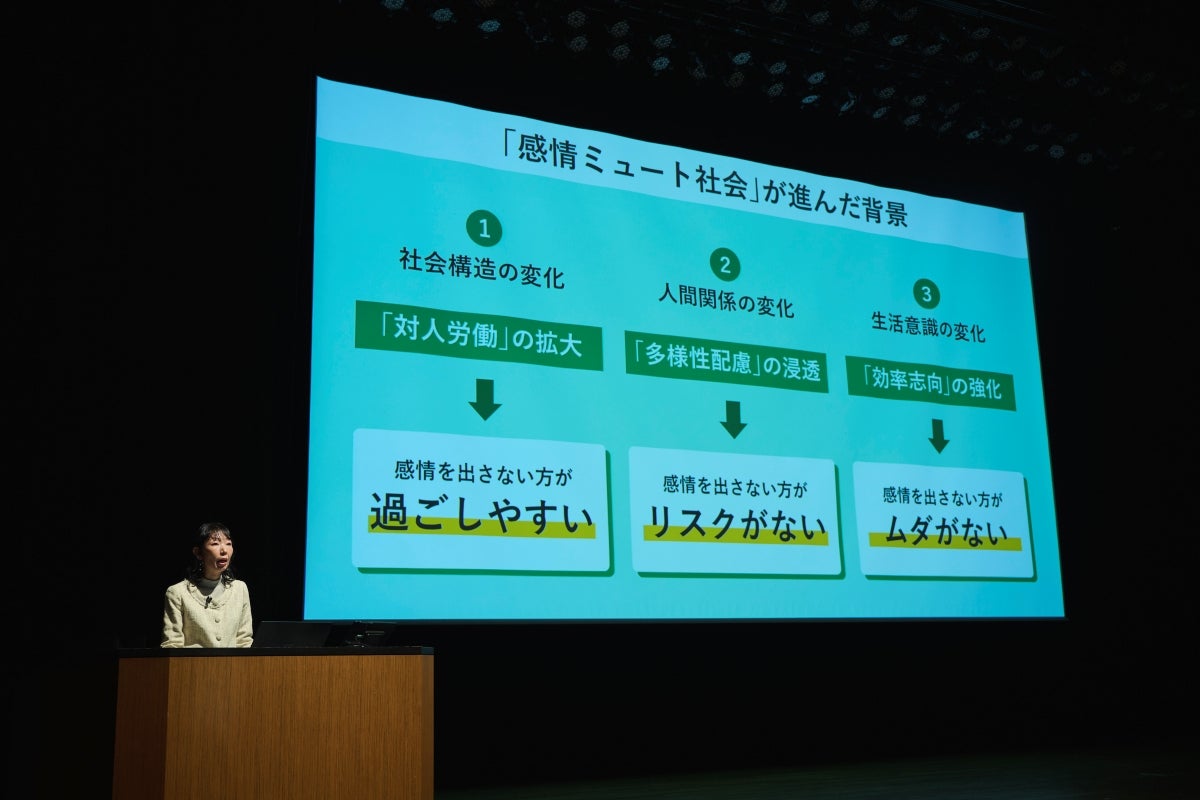 定量データや社会構造の変化をもとに、あえて他者に感情を出さないことを選択する「感情ミュート」が社会に広がった背景を、松井上席研究員より説明しました。