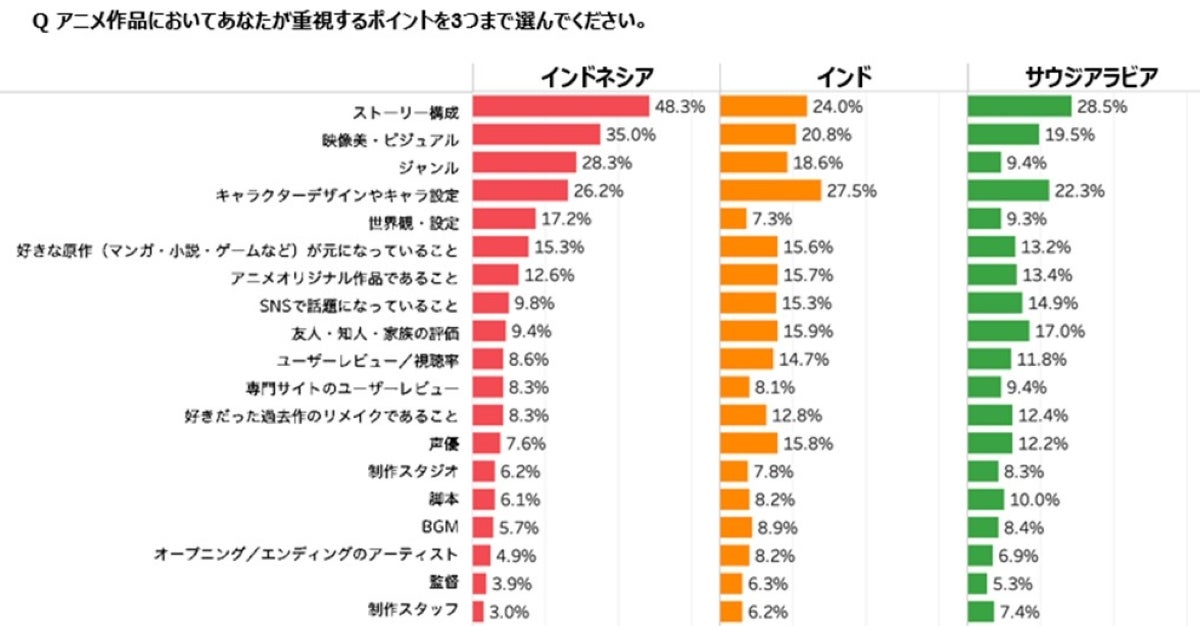 水越:アニメ作品で最も重要だと思うポイントについて質問したのですが、インドネシアでは「ストーリー構成」が、インドやサウジアラビアでは「キャラクターデザインやキャラ設定」が高い割合を占めることがわかりました。アニメ市場がある程度成熟しているインドネシアにおいては、ストーリー構成や映像美・ビジュアルといったアニメーション作品としての完成度が評価され、「ファン育成フェーズ」であるインド、サウジアラビアではキャラクターそのものを楽しむことが入り口になっていると考えられます。