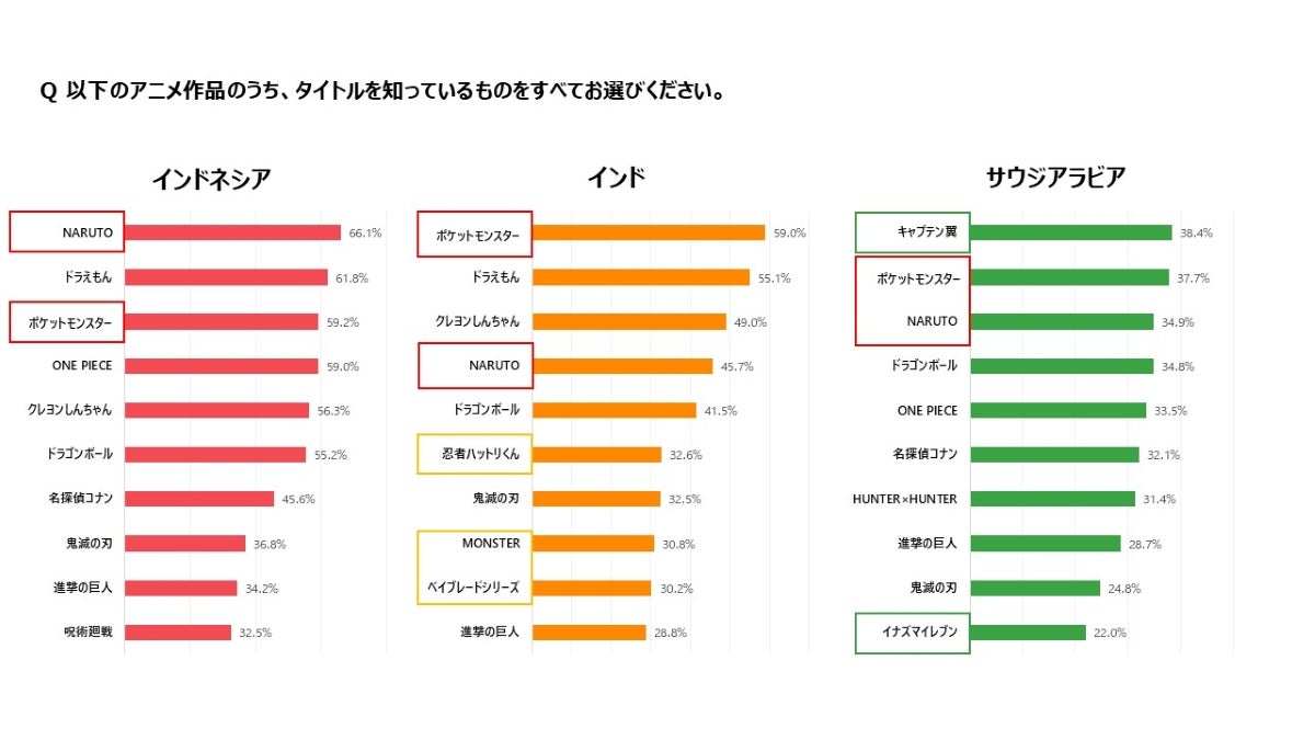 中川:あとはやはり、国ごとに特有の人気を誇るアニメ IPがあるということ再度確認できました。インドでは「忍者ハットリくん」や「ベイブレードシリーズ」の認知率が3割を超えるという特徴的な結果になっていましたし、サウジアラビアでは「キャプテン翼」や「イナズマイレブン」が上位にランクイン。サッカー人気が高いお国柄が反映されていると感じました。