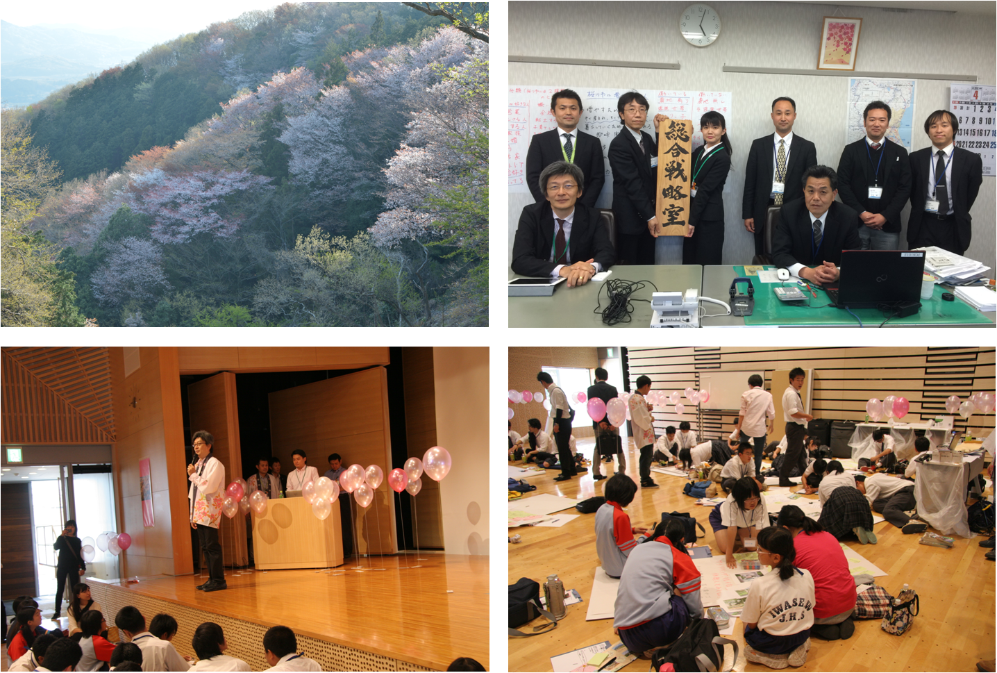(左上)美しい桜川市の山桜。(右上)桜川市総合戦略室のメンバーと。