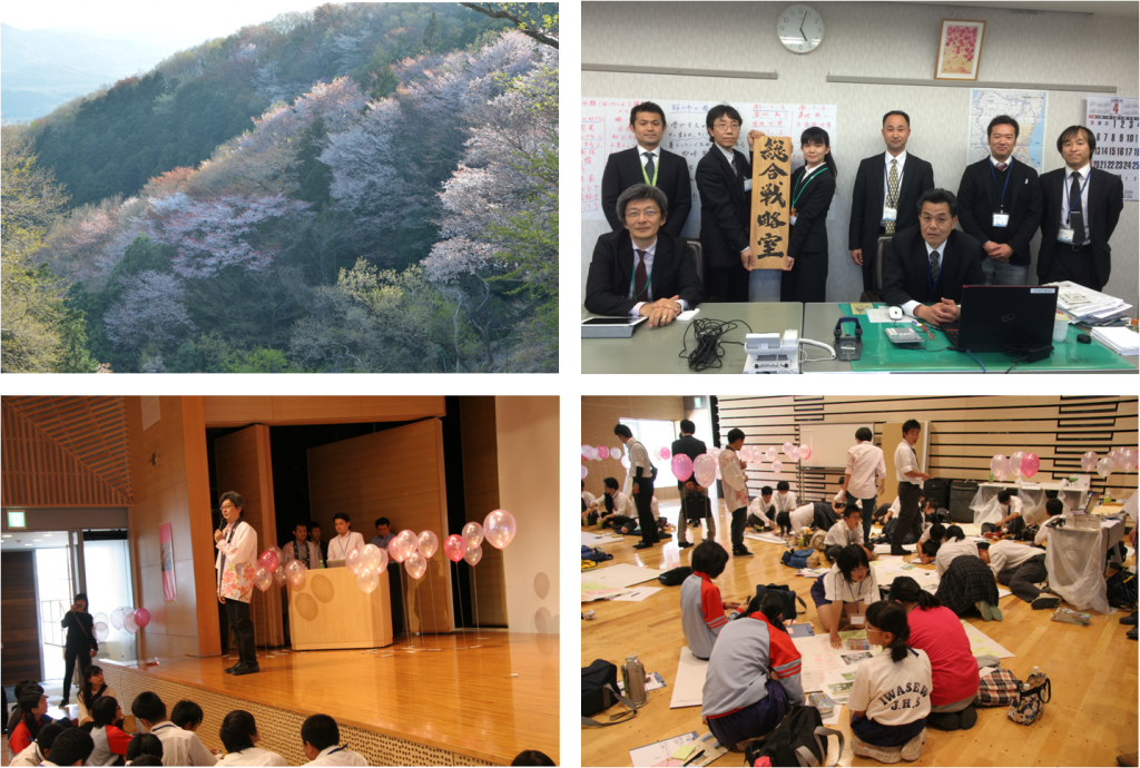 (左上)美しい桜川市の山桜。(右上)桜川市総合戦略室のメンバーと。