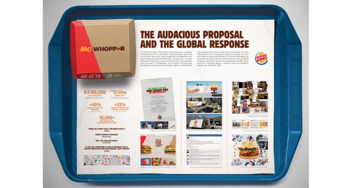「国際平和デー」に向けて米バーガーキングが、普段は競合している米マクドナルドと“停戦”して、一緒にマッシュアップバーガーを作ることを提案するというPR施策。15段広告の活用などでうまく好意を形成し、大量のPR露出とファン化に成功。提案したのはニュージーランドの広告会社で、自国で得意先に自主的にプレゼンテーションしたところ、最初は難しいという反応だったというが18カ月をかけて粘った結果、本国である米国で実施されました。