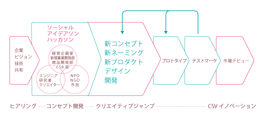 ボランティア団体の支援を通じて被災地の課題に向き合うと、被災地の課題は、高齢化や過疎の問題だったり、一次産業の課題だったりと、実は日本全国の課題と共通だということに気付きました。そして、多くのNPOや団体の人材や知見を、社会課題の解決に関心のあるエンジニアやクリエイターと結ぶことで新たな「創造的な発想」が生まれることを確信しました。さらに、CSV(Creating Shared Value:共通価値の創造)を志向する企業とも共創していけば、NPOや団体、エンジニア、クリエイター、企業関係者がWin-Winの関係になり、社会的にも意義のある事業・サービスを開発できるかもしれないと考えました。それが「ソーシャル・クリエイティブ・クロス」の原点になります。NPO、エンジニア、クリエイター、企業関係者が課題を共有した上で、「ソーシャルアイデアソン」をおこない、そこで得られた事業アイデアを市場デビューまで導くサービスです。