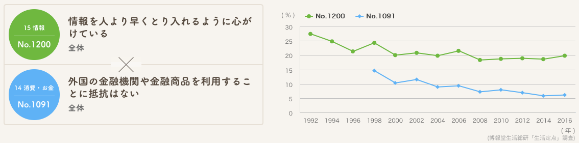 しかしこれと似た推移を示している「似てるかもグラフ」が、「外国の金融機関や金融商品を利用することに抵抗はない」という投資への関心であるという点が、私はちょっと気になりました。つまり現在の「新しい情報を求めている生活者」とは、「≒投資情報などに敏感な人」とイメージされたからです。