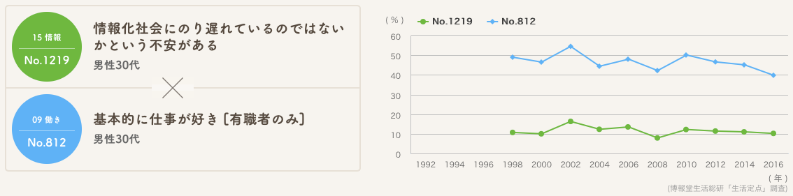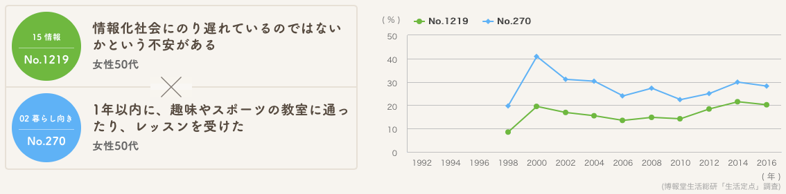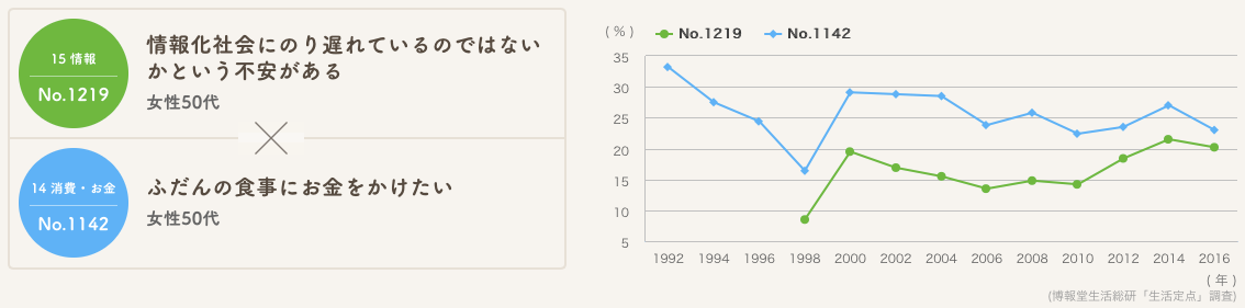 「仕事に没頭して、でも世の中からずれてきているのではないかという不安が、ふと頭をもたげる」様子の30代男性と、「趣味やスポーツを始めたり、普段の食事を豪華にする」ことで時代への乗り遅れの不安を解消する50代女性、という捉え方には、これはこれで生活者のリアリティーが感じられないでしょうか?