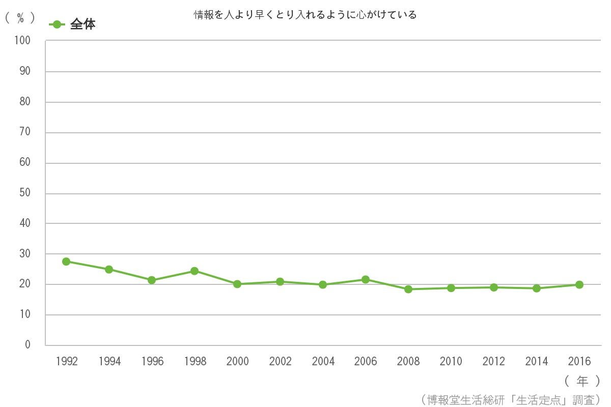 例えば「情報を人より早くとり入れるように心がけている」人は情報過多社会に意外や意外? 1992年の27.4%から2016年の19.8%までロングトレンドとしては緩やかな低減を続けている模様です。もしかしたら現在の生活者は情報が増え過ぎれば増え過ぎるほど、新しい情報についていく気持ちが萎えてくるのかもしれませんね。