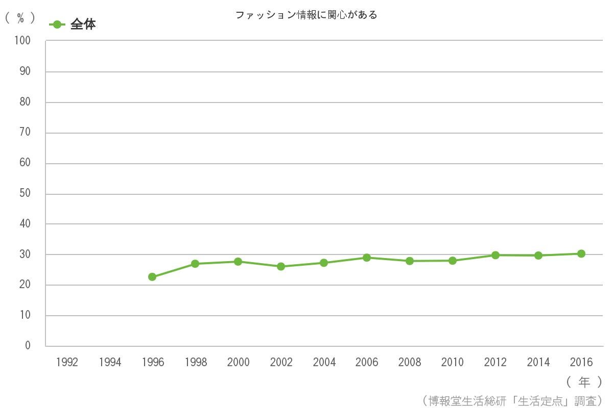 一方で「どのような情報に関心を持っていますか?」という問い掛けに「ファッション」と答える生活者は上記とは対照的にこのところ伸び続けており、1996年22.6%から2016年度は30.2%と初めて30%を上回りました。