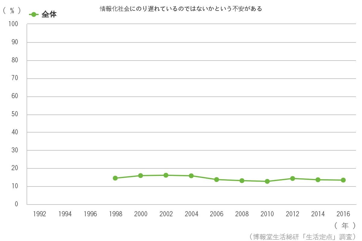 情報に関して、また違ったデータを見てみましょう。「新しい情報」へのモチベーションはこのように徐々に低下を続けているようなのですが、一方で「情報化社会にのり遅れているのではないかという不安がある」と答える人は、全体では横ばいで推移しています。つまり「新しい情報」がなくてもそれなりに世の中にはついていってるよ、というのが世の中の全般的な意識ということです。