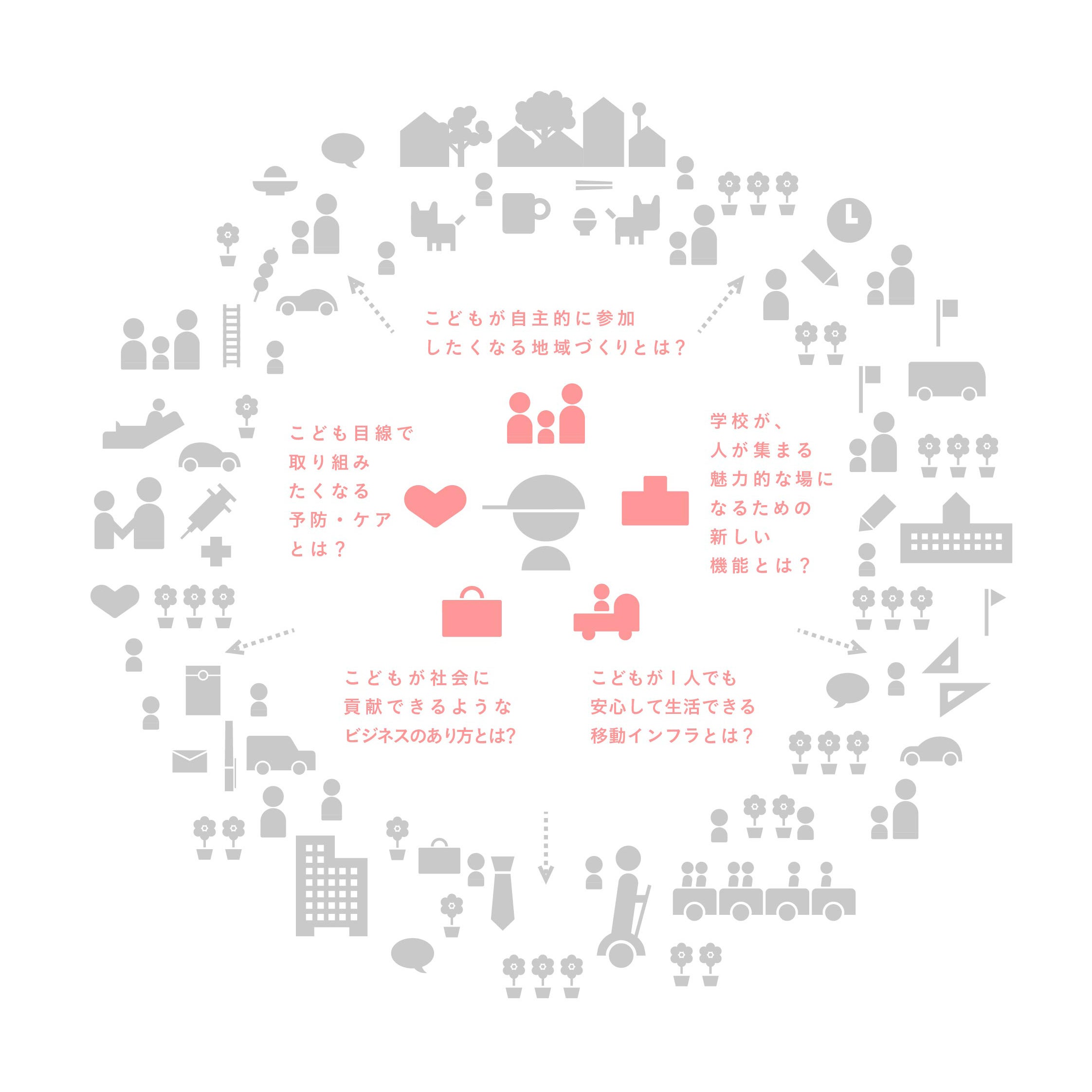 こどもが減っていく中で学校はどのように役割をシフトしていくべきか?「孤育て」家族にとっての理想的な住まいの間取りは?こども発想で考える魅力的なヘルスケアとは?こどもが1人でも安心して行動できる公共インフラとは?山のように積まれているこれらの問いへの答えを考えていくことは、こどもたちや家族だけでなく結果的にすべての人々の暮らしにとっての「ウェルビーイング」のヒントになるのではないか。私たちはそのように考え、未来のこどもたちの暮らしに思いをはせてみることにしました。