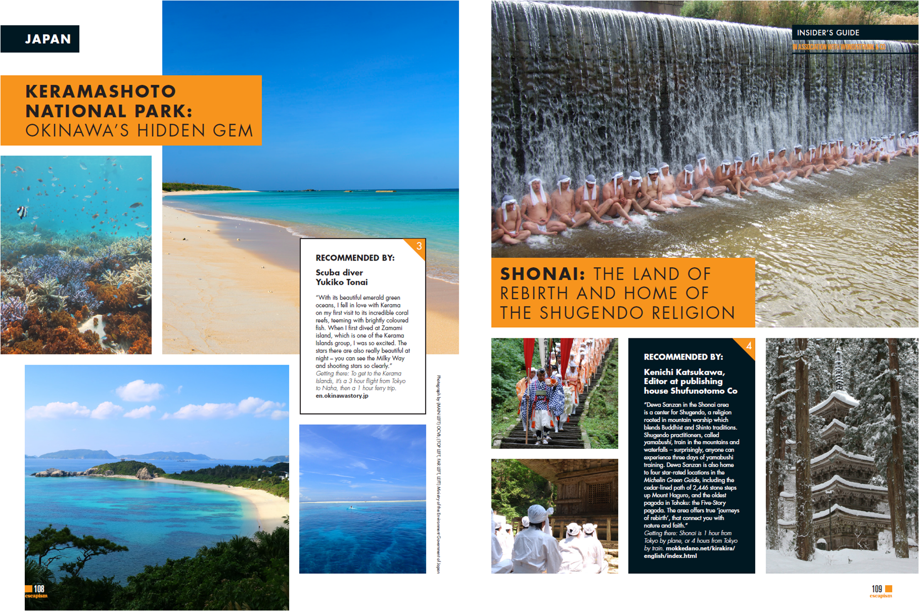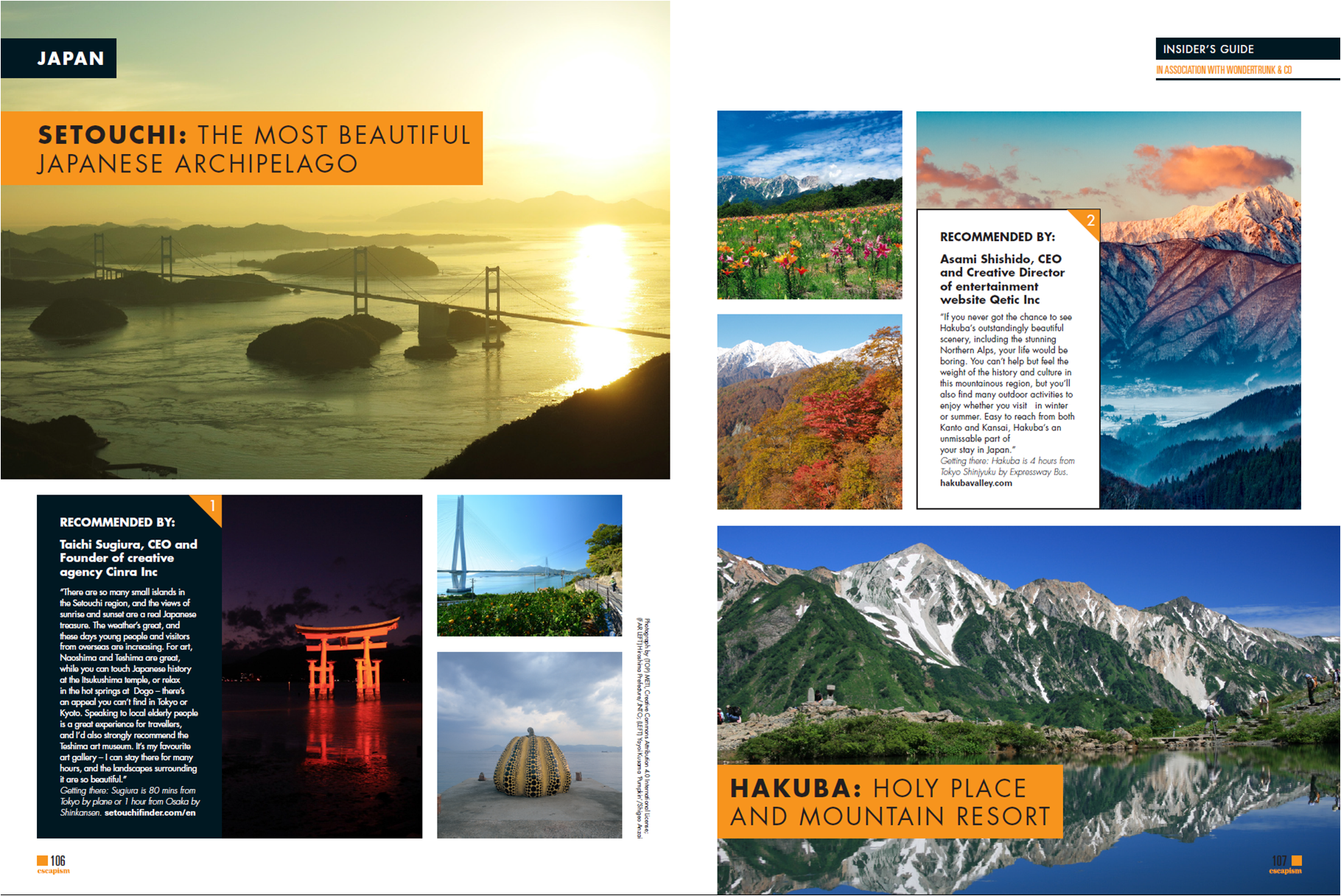1つは瀬戸内エリアに、「広島」があることです。宮島と原爆ドームという2つの世界遺産は、アジアよりもむしろ欧米の旅行者に知られており、その周辺の観光地への興味もあがってきています。もう1つは、このエリアが直島や豊島を中心とする「アートの島」、しまなみ街道をめぐる「サイクリングの島」、厳島神社の宮島や村上水軍の能島など「歴史の島」などなど、多様な島の魅力をもっていることです。この情報をイギリスの編集チームに伝えたところ、Escapism誌は、瀬戸内に「THE MOST BEAUTIFUL JAPANESE ARCHIPELAGO –日本の最も美しい多島美-」というコピーをつけてくれました。