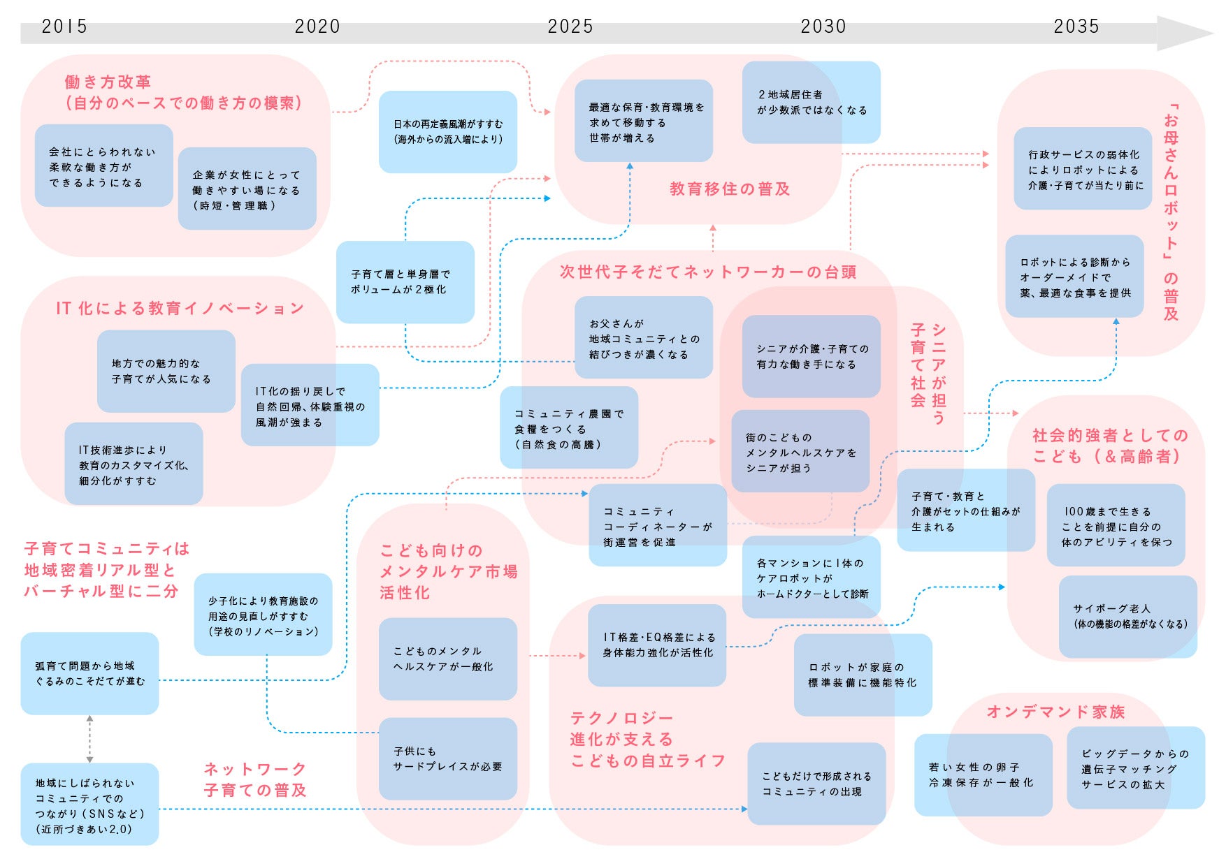 博報堂イノベーションデザインの提供する「Future Senario Mapping」というプログラムを使い、こそだて研メンバーを中心に「未来のこそだて家族シナリオマップ」を作成しました。