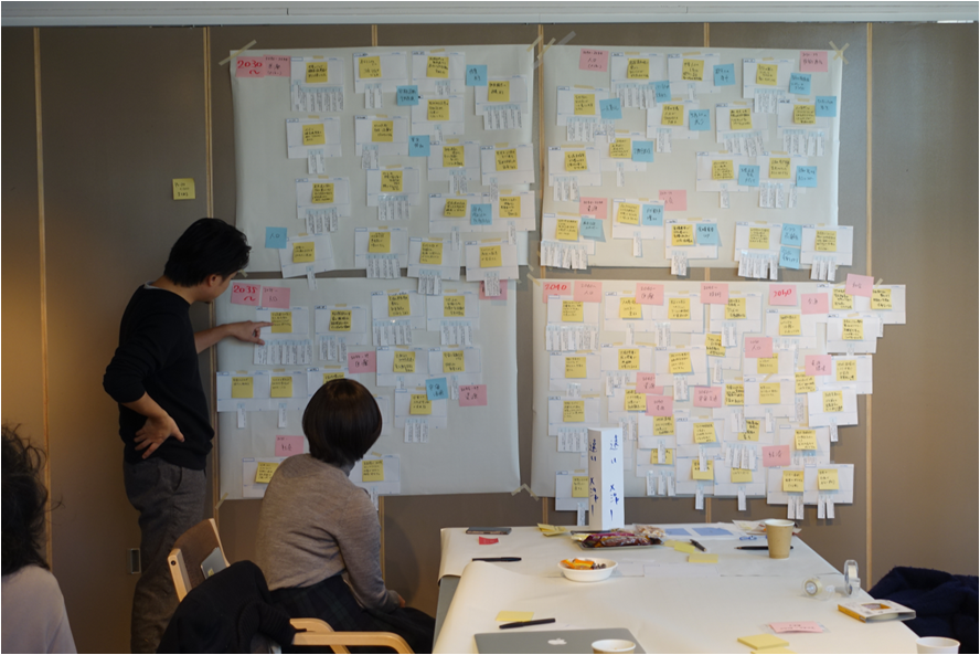 上記のプロセスで収集・分析した情報について、ワークショップ形式でディスカッションを重ねながらそれぞれの情報に関する未来への示唆を見つけ、それらの示唆を特定の文脈に基づきコンセプト化、ストーリー化できるように編集をするとシナリオが出来上がります。つくったシナリオを、それが起こりうるタイムラインを想定して時系列にマッピングしたらマップの原型の出来上がりです。