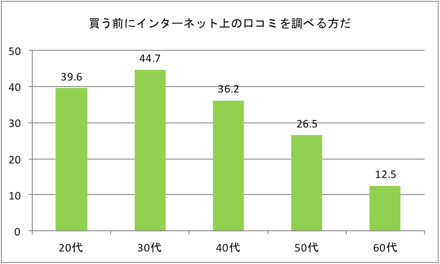 また、「買う前にインターネット上の口コミを調べる方だ」という人も、20~40代の若い世代では40%前後を占めています。