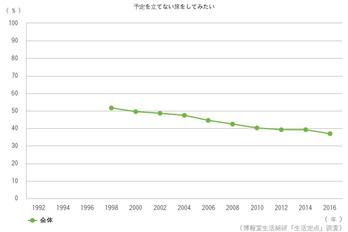 「予定を立てない旅をしてみたい」という人は、調査開始の1998年時点では51.6%でしたが、最新の2016年で36.9%となっており、減少傾向が続いています。