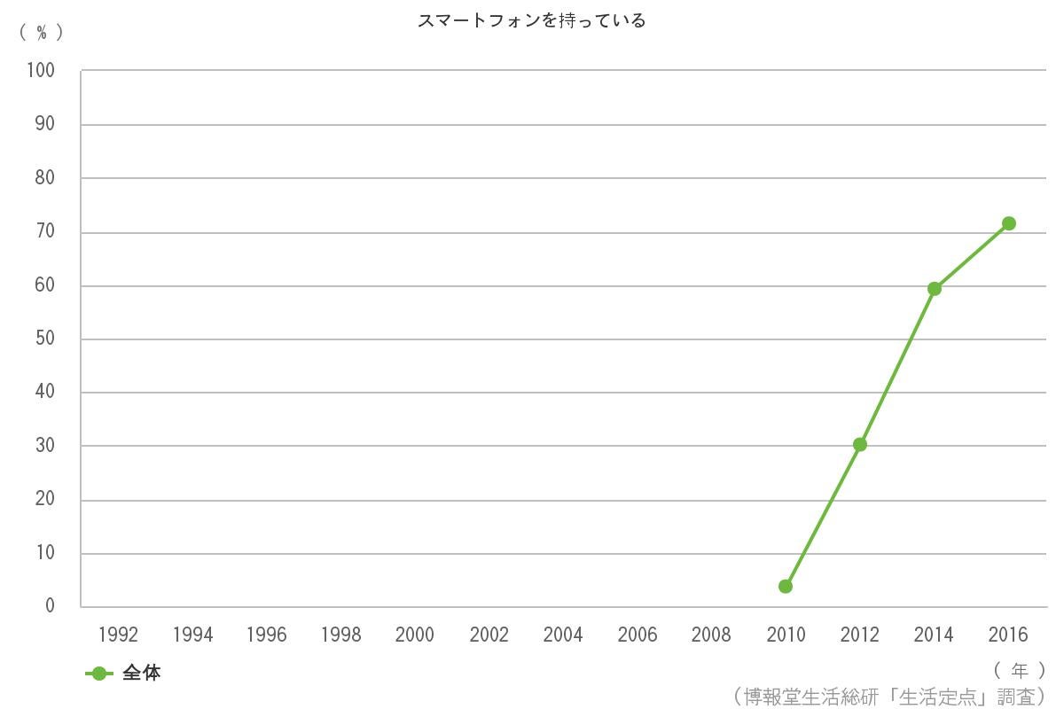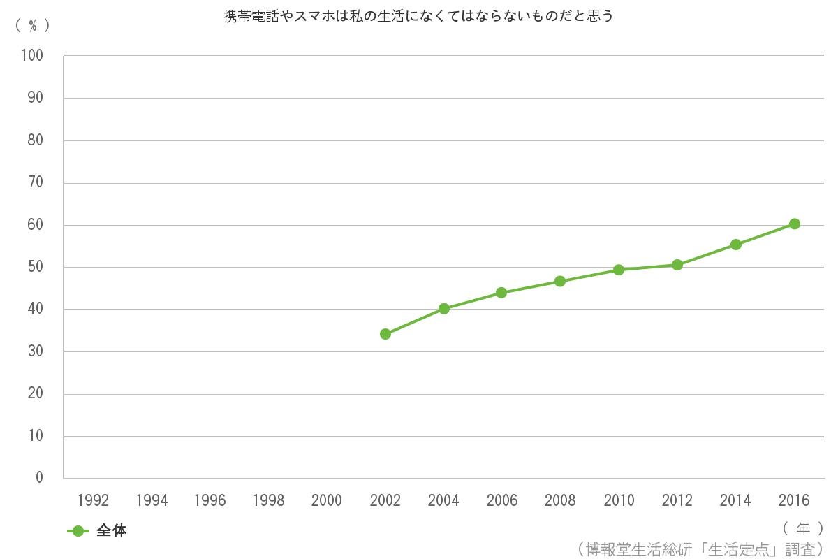 このことは、私たちの気持ちの上でのスマートフォンの重要度も高めることとなりました。「携帯電話やスマホは私の生活になくてはならないものだと思う」と答えた人は、「スマートフォンを持っている」と答えた人ほどではありませんが、右肩上がりの上昇を続けています。