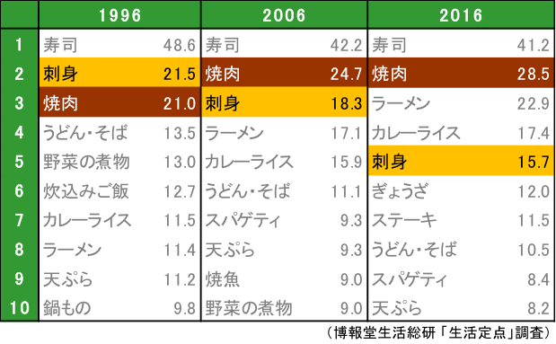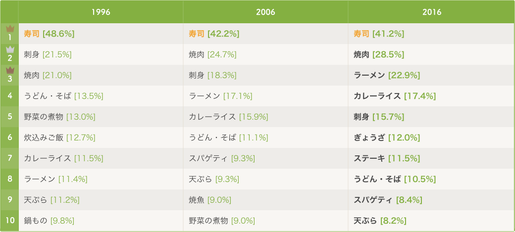 「好きな料理ベスト3」をランキングで見ると、1996年から20年間、不動の1位は「寿司」! まぁ、ひとくちに寿司といってもカウンター寿司、回転寿司、持ち帰り寿司と、裾野は広がってそうですが…。いずれにせよ、「ザ・和食」ってな感じの寿司が1位。でも、その一方、寿司ネタにもなる「刺身」が2位、3位、5位と順位を下げているのも気になるところ…。