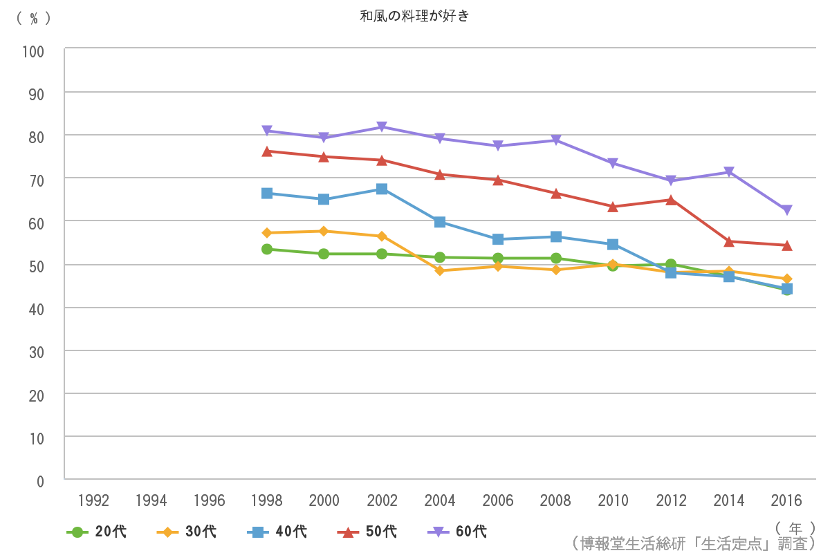 おやおや、20~60代のどの年代も右肩下がりまっしぐら! しかも、よぉ~く見ると、イメージ的には和食好きそうな40代以上で減り幅が大きい。1998年からだと20ポイント前後も減っていて、むしろ、20代・30代の方が踏ん張ってるぐらいです。
