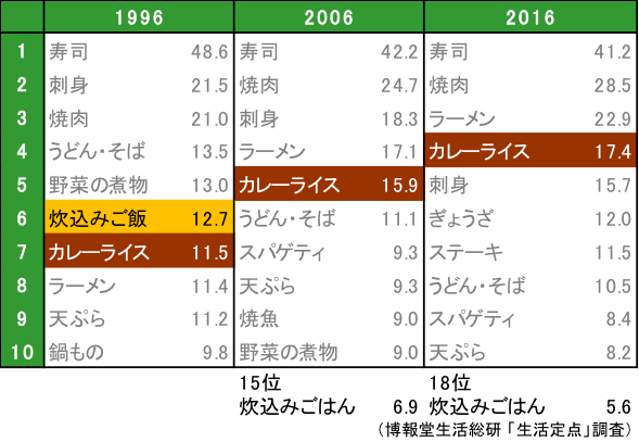 日本の食卓に欠かせない、お米。「炊込みご飯」のような和風系の「ごはん」は10年前からトップ10から消えてしまいました。逆に席捲するのが「カレーライス」を代表とする洋風系の「ライス」。「○○ライス」って、オムライス、ハヤシライス、タコライス、トルコライスなど、今や山ほどありますもんね。