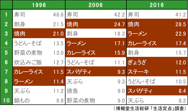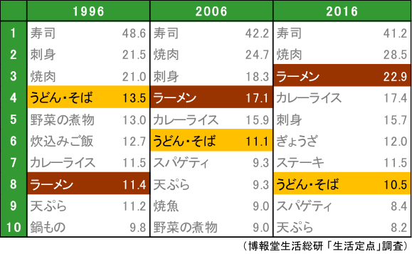 2016年にトップ3入りした「ラーメン」。実は、じわじわと攻め込んできてたんですねぇ。20年前には「ラーメン」を抑え込んでいた「うどん・そば」ですが、10年前に上下が逆転。2016年には2倍の差をつけられてしまいました。