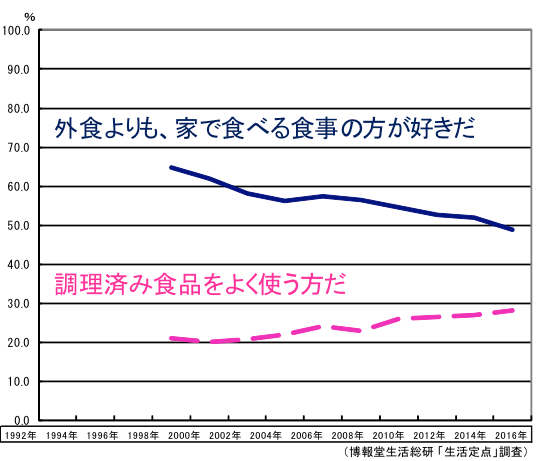 茶色い料理を見ていて思うのは、どれも外食でも、よく食べるものだということ。同時に、レトルトやインスタント、冷凍食品でもお世話になります。「生活定点」では食卓の茶色化に呼応するように、「外食よりも家で食べる食事の方が好きだ」は減り、逆に「調理済み食品をよく使う方だ」が増加。外食派や中食派は着実に増えています。