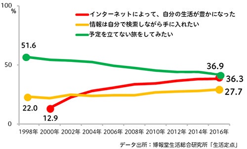 博報堂生活総合研究所の「生活定点」調査では、「インターネットによって、自分の生活が豊かになった」2000年12.9%→2016年36.3%、「情報は自分で検索しながら手に入れたい」1998年22.0%→2016年27.7%、「予定を立てない旅をしてみたい」1998年51.6%→2016年36.9%、とネット検索で情報を積極的に手に入れたいが、計画を立てたりせずに行動を起こすことに対しては消極的になっている生活者が増えている。