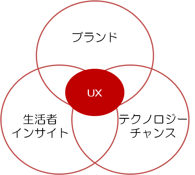 博報堂では、この4月に15名ほどからなるUXプロジェクトチームを立ち上げました。このプロジェクトでは、まずUXとは何かを私たちなりに定義するところから始めています。いま我々としては、「 “ブランド”と“生活者”と“テクノロジー”の交点に、事業成長につながる新しい体験をつくりだすこと」と捉えています。