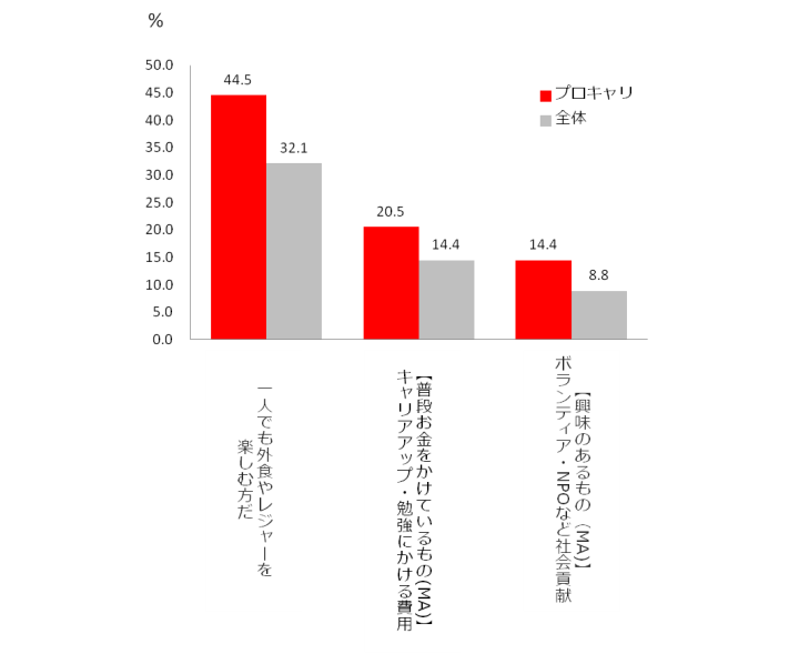 結婚願望が他人より低く(前回コラム参照)、一人でいても色々なアクティビティを楽しめるのは、プロキャリさんの特徴のひとつです(グラフ項目①)。そのかたわら、キャリアアップや資格取得などの勉強にも勤しむ傾向があります(グラフ項目②)。ただ自分の仕事だけに熱心というわけではなく、全体より社会貢献意識が高いという特徴も挙げられます(グラフ項目③)。