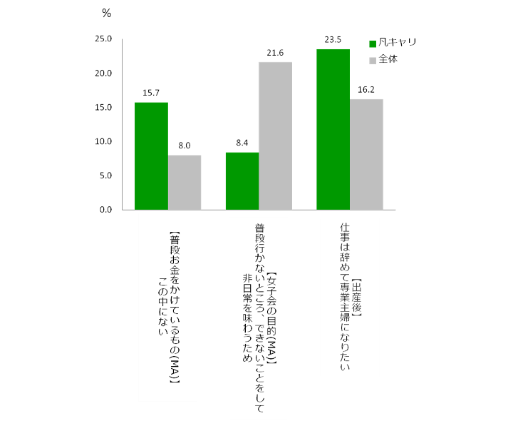 最後は、マイペースで基本受け身&無欲なクラスター、凡キャリさんの紹介です。あまり外との交流を好まないため、家で過ごす休日も多いのではないでしょうか。これといった消費の傾向もなく(グラフ項目①)、たとえば女友達との集まりなどの遊びにも非日常感は求めません(グラフ項目②)。ただ、出産後の専業主婦願望はやや高めです(グラフ項目③)。一昔前に多数派だった女性のライフコースを歩むのだろう、とぼんやりと思っているのかもしれません。