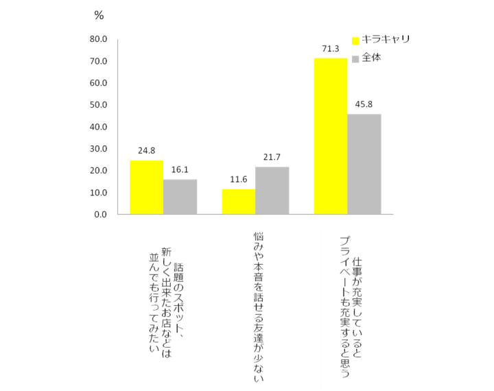 情報交換や人脈づくりに熱心で、“今”を楽しむことに全力投球なキラキャリさんはこんな感じでしょうか。流行をいち早くキャッチし(グラフ項目①)、話題のスポットには積極的に足を運んでみるのがキラキャリの特徴。でも実は、広い人間関係をキープしている一方で、悩みや本音を話せる本当の友達がいる、とも自覚しているのが面白いギャップですね(グラフ項目②)。また、仕事の充実度がプライベートにも影響するとも考えており(グラフ項目③)、仕事に対するモチベーションが高いのも意外な特徴です。