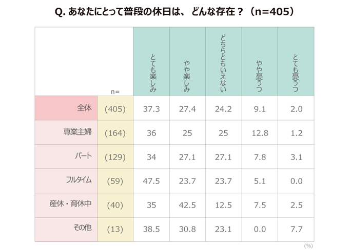 結果として、専業主婦の方の「休日は憂うつ(やや憂うつ+とても憂うつ)(14.0%)」が高かったのが印象的でした。平日子どもが幼稚園などに通い始めれば、自分の時間があるからなのでしょうか。休日といっても、親業は休める訳でもないですし、平日以上に自分のペースでは動けないので、それが憂うつの要因なのかもしれません。