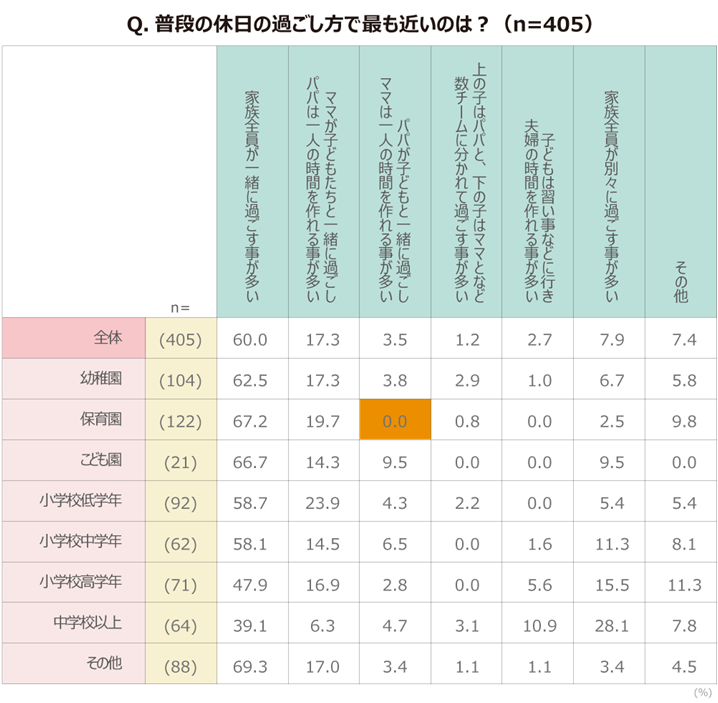 ちなみに、「家族全員でバラバラに過ごすことが多い」という回答が、小学生低学年未満の子どもがいる家族でも少ないながらいますね(こども園9.5%、幼稚園6.7%)。休日はおじいちゃんやおばあちゃんと過ごしているということなのかな?どういう休日オペレーションなのかちょっと気になりました。