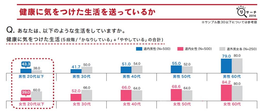 【健康に気をつけた生活】を見てみると、道内20代以下の男性の意識は43.3%と、30代や道外20代以下男性よりも高くなっています。また、道内20 代以下の女性は他年代と比べ、道外との差がもっとも大きく、低くなっています。今回はこの道内20 代男女に注目し、「健康的な生活」の意識の高さ・低さの理由を調べてみました。