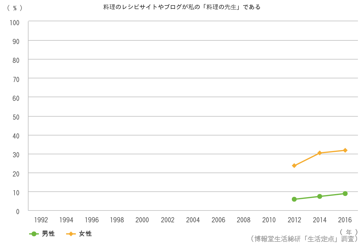 「雑誌でメイクや料理などのHow-toを学んでいたみんなが徐々にWEBに移っているのでは?」と思い、近い項目を探してみました。2012年からの追加項目なので「サイト・ブログ」で聴取していますが、WEBコンテンツを「先生」として活用している人が特に女性で増えていることが読み取れます。