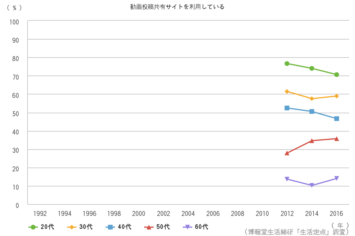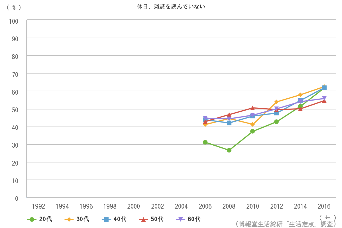 生活者にとって身近になった動画。みなさんどの程度利用するようになっているのか、生活定点を使って年代別の変化を追ってみました。動画オンデマンドサイトの台頭により、「動画投稿共有サイトを利用している」人はやや減少していますが、それでも特に20代における動画投稿サイトの利用は7割強と高く、目立っています。一方、「休日雑誌を読んでいない」は6割強と増加傾向にあります。