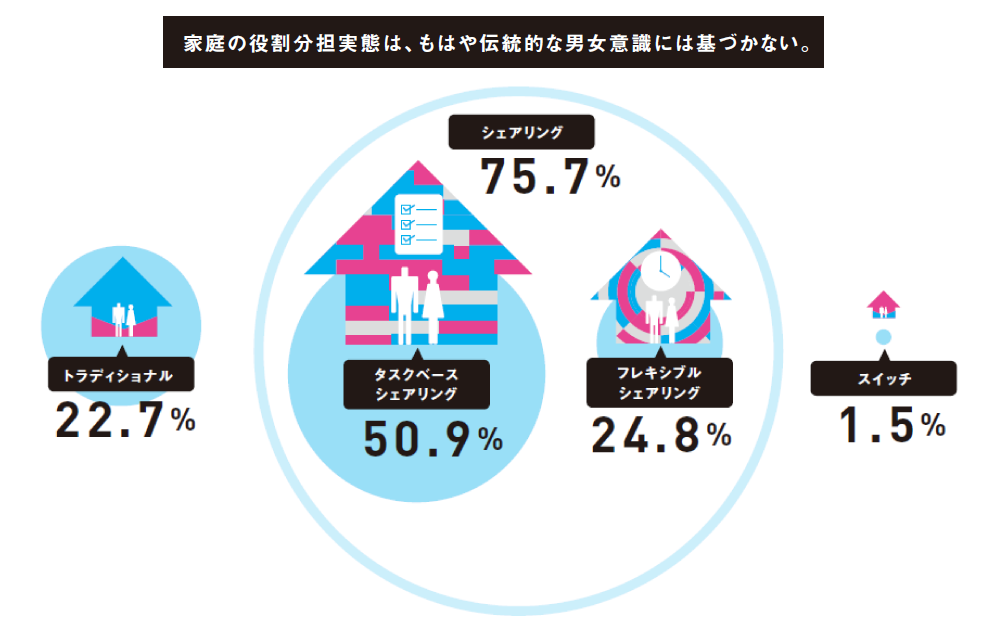 このように、男女の平等の状況とは別に、タスクベースシェアリングタイプとフレキシブルシェアリングタイプを合わせると、夫婦で家事や育児をシェアするタイプは約76%にのぼり、アセアン家庭の実態として夫婦で家事や子育てを平等に役割分担している世帯が既に過半数を占めていることが分かります。