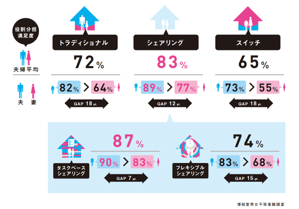 タスクベースシェアリングタイプが最も満足度が高くなっています。どのタイプも夫側の満足度が妻より高いのが特徴的ですが、タスクベースシェアリングタイプは夫と妻の満足度ギャップが小さいのが特徴です。