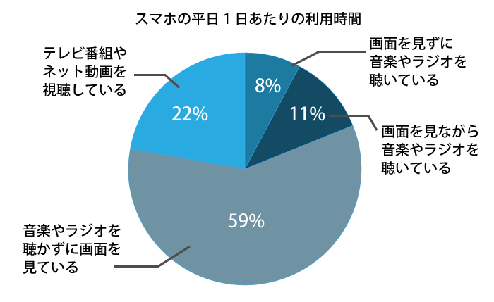 岡田:このプロジェクトを開始するに当たり、「スマホの平日1日あたりの利用時間シェア」を調査してみました。「画面を見ずに音楽やラジオを聴いている」層が8%、「画面を見ながら音楽やラジオを聴いている」層が11%、「テレビ番組やネット動画を視聴している」層が22%、「音楽やラジオを聴かずに画面を見ている」層が59%いることがわかりました。
