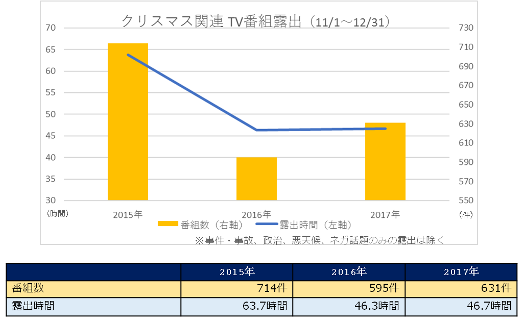 2015年に714件、63.7時間の露出があったクリスマス情報は、翌2016年に595件、46.3時間と激減しています。件数にして20%、時間にして30%もの減少です。