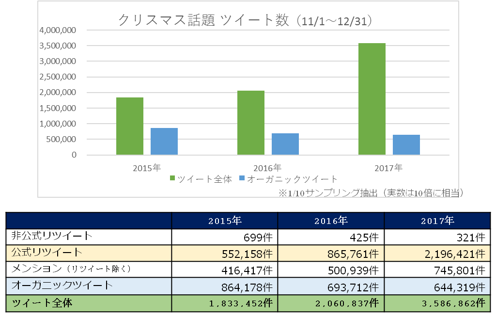 ツイート全体の件数は、2017年に2015年の約2倍にまで伸びています。公式リツイートは約4倍と爆発的な伸び率です。