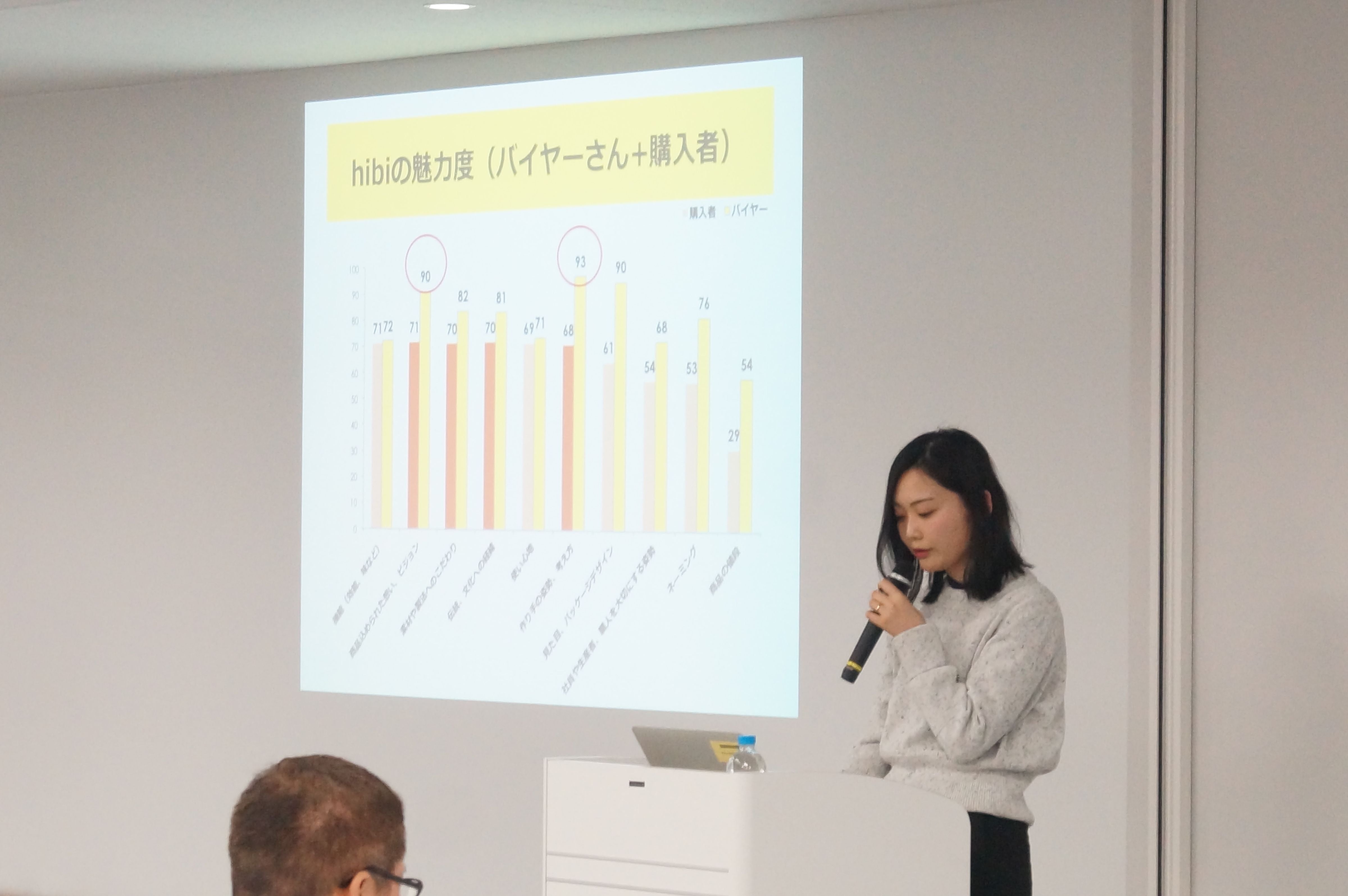 購入者やバイヤーにアンケートを実施したところ、hibi購入者の7割が「志に共感する」と回答しており、さらにその後SNSに投稿したり、友人に勧めたりといった行動に移している実態を解説しました。さらにバイヤーのほとんどがブランド力よりもその背景のストーリーを重視しており、志に対するバイヤーの共感値が非常に高いと指摘。だからこそ志が購入者へと伝播できているし、そんなバイヤーさんとしっかりとした関係性が持てているのがhibiである、と解説しました。
