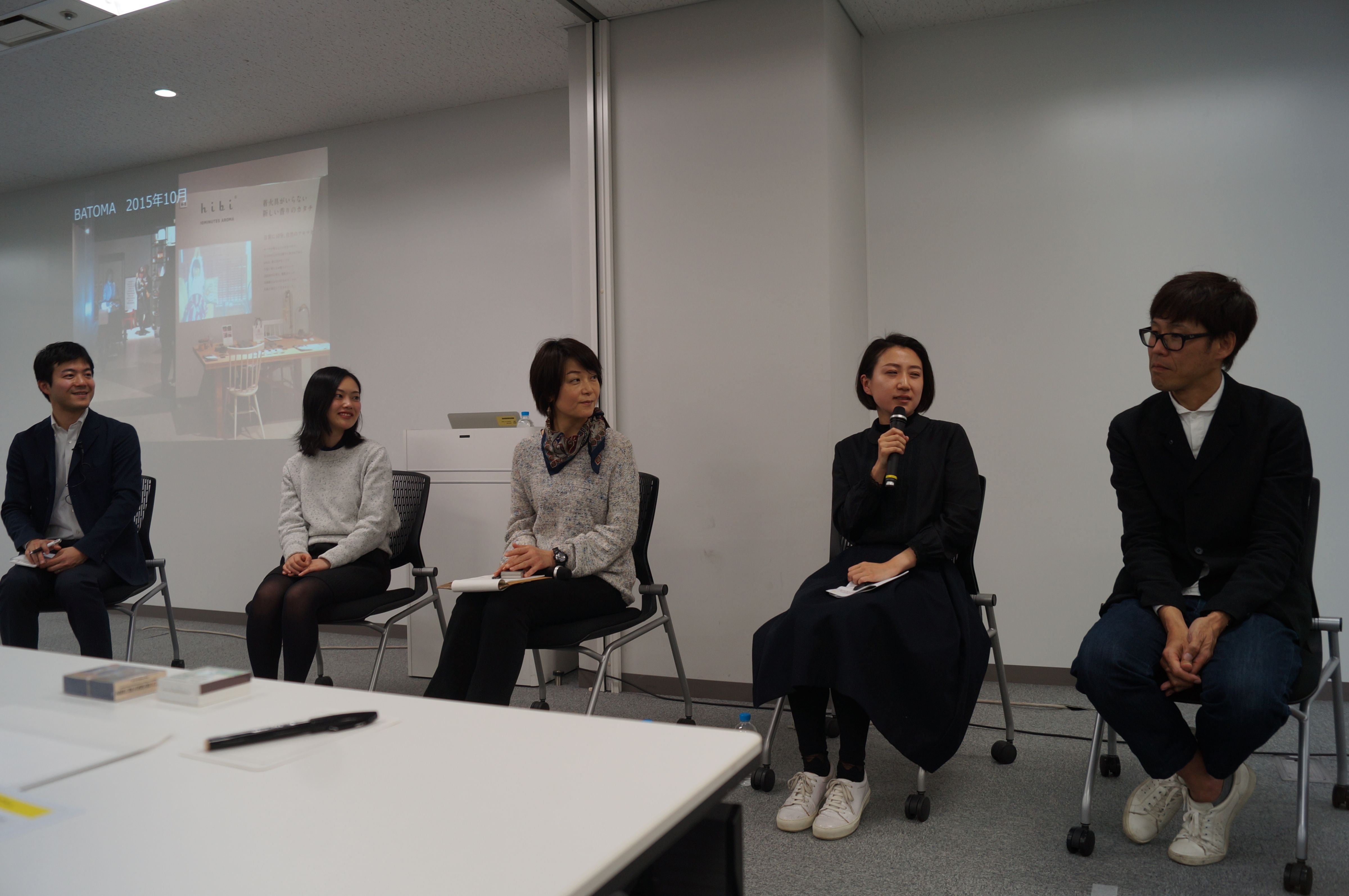 第二部後半では代官山 蔦屋書店バイヤーの勝部佑香さん、篠塚陽子さんも交え「『hibi』に学ぶ、熱い仲間の作り方」と題したクロストークが行われました。文具コンシェルジュでもある篠塚さんが最初にhibiを見つけたのは、代官山 蔦屋書店の商材を発掘するために訪れた展示会場だったそうです。「最初はロゴやコピー、日常(日々)のリビングにあるhibiを表現したブース全体の完成度が高く心に残り、その後嵯峨山さんの想いやマッチ業界の実態、お香という同じ地場産業と手を取り合ったことなどのバックストーリーを知り、感動してファンになった」とhibiとの出会いを述懐。