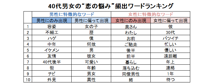 第1回は20代に見られる恋の悩みの男女差について掘り下げましたが、第2回では40代男女の恋について見ていきます。