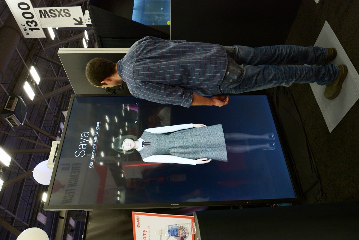 撮影した体験者の顔の画像をリアルタイムで分析し、それぞれがある閾値を超えると目の前の映像がチェンジする仕組みになっています。体験者にとっては、自分の表情に対して瞬時にSayaが「はにかむ」「目をそらす」といった自然なリアクションを返してくれるわけです。また体験者には、Sayaが映し出される94インチのモニターの前に立ってもらうわけですが、Sayaは特にブースのようなもので仕切られてはいません。周囲にどれだけ人がいても、目の前にいる体験者本人の顔だけを認識するようになっている。これは開発における大きなブレークスルーのおかげでした。また準備が間に合わなかったのですが、CGと人が目線を合わせるという体験もつくりだしたいとも思ってました。ここだけの話(笑)、体験者の目線を高い精度で追える解析AIの準備も、裏でちゃっかりしていました。いつか日の目を見れるといいですね。
