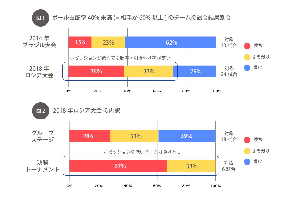下の図1は「支配率が40%未満のチーム」について前大会の2014年ブラジル大会と今回のロシア大会の結果を比較したデータです。