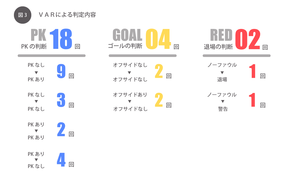 また今大会から新たに導入されたVAR(ビデオ・アシスタント・レフェリー)※も、意外性を生む理由の一端になっていたかと思います。VARで主審が実際に映像を確認した試合は全20試合で、計24回行われたうちPKに絡んだ判定が18回ありました。とくに、PKなし→ありの判定になったケースが最多で、計9回ありました。こうした判定はグループステージで多く発生しましたが、決勝トーナメントでは減っています。おそらく大会が進むにつれ選手もVARを警戒するようになり、シミュレーションのような“わかりやすい”行為を控えたのかもしれません。
